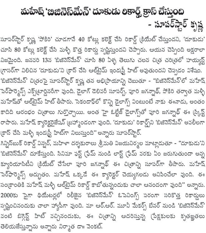 Watch Videos of Prince Mahesh Business Man Records, Collections ,Trailers, Interviews, Audio Release....